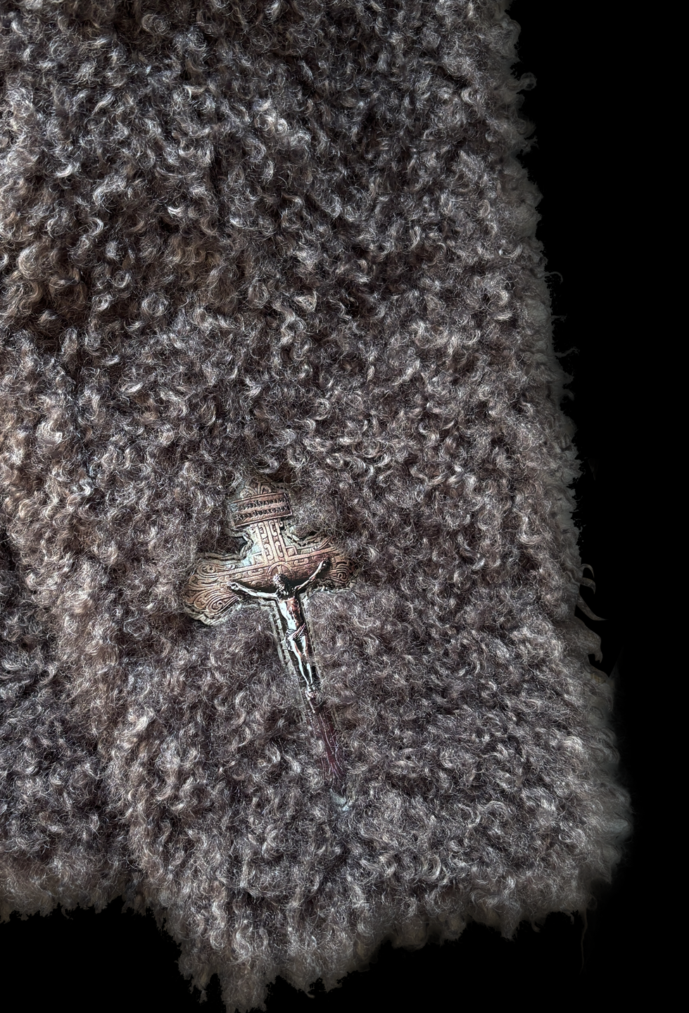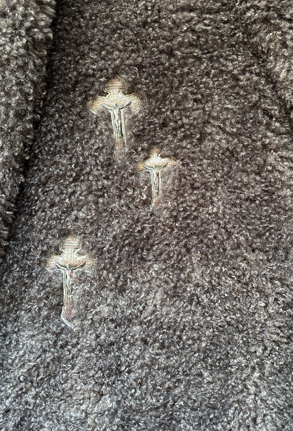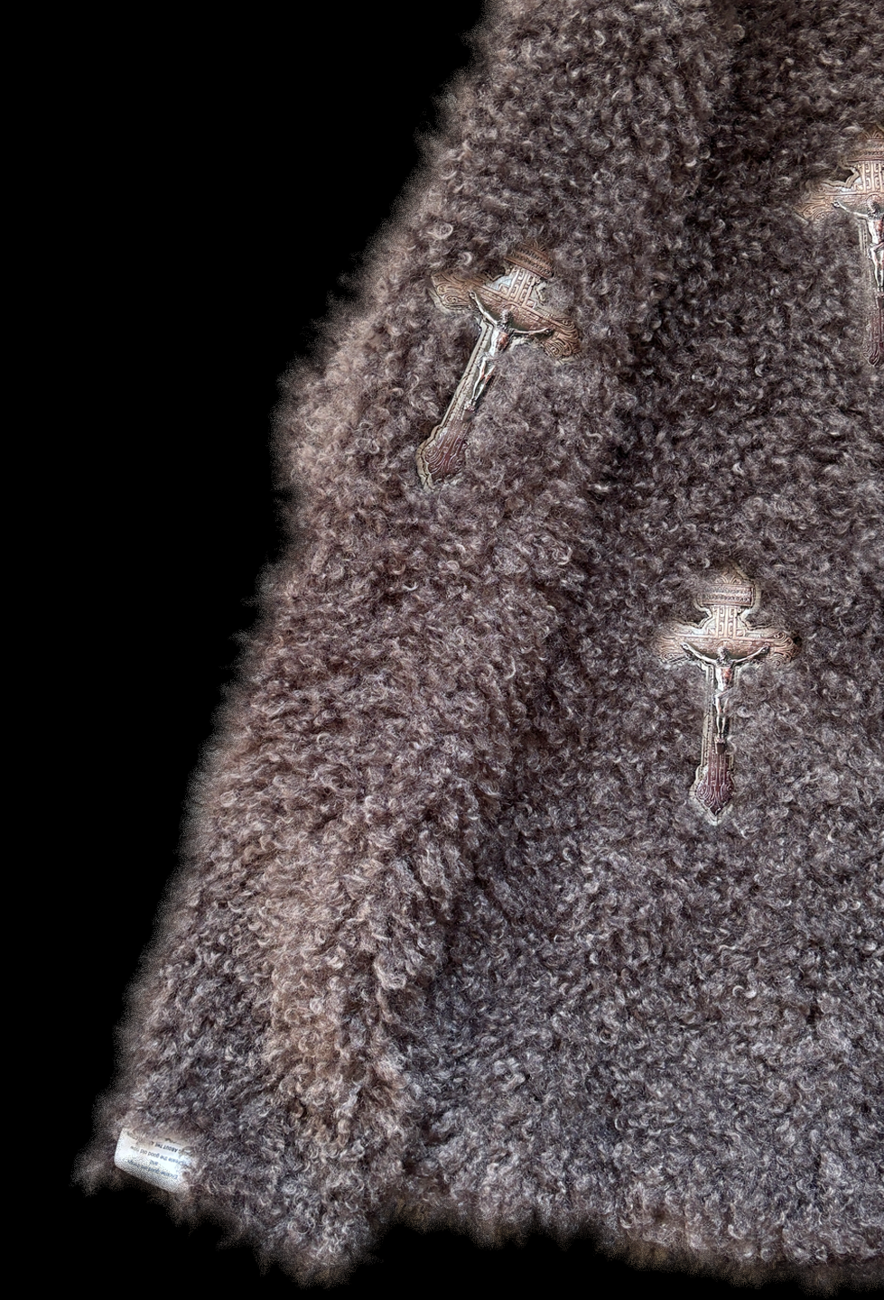 プードル犬の巻き毛のような、くるくるとした質感を再現したファー素材に3Dのクロスを配置しております