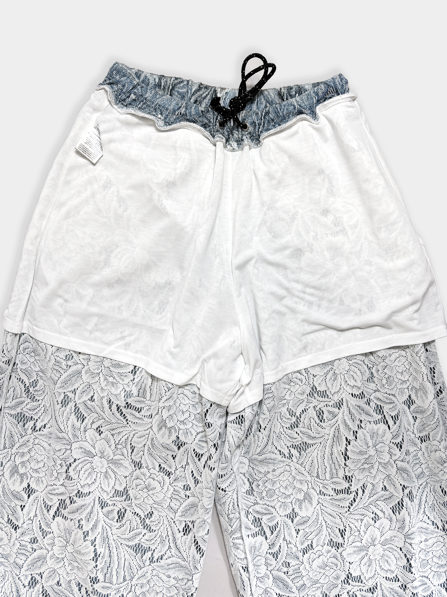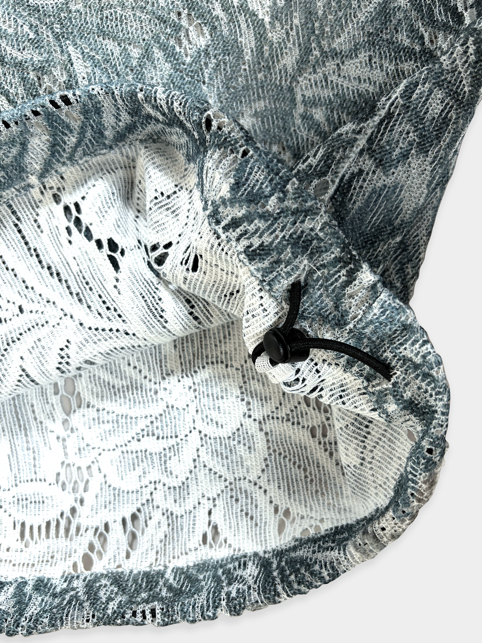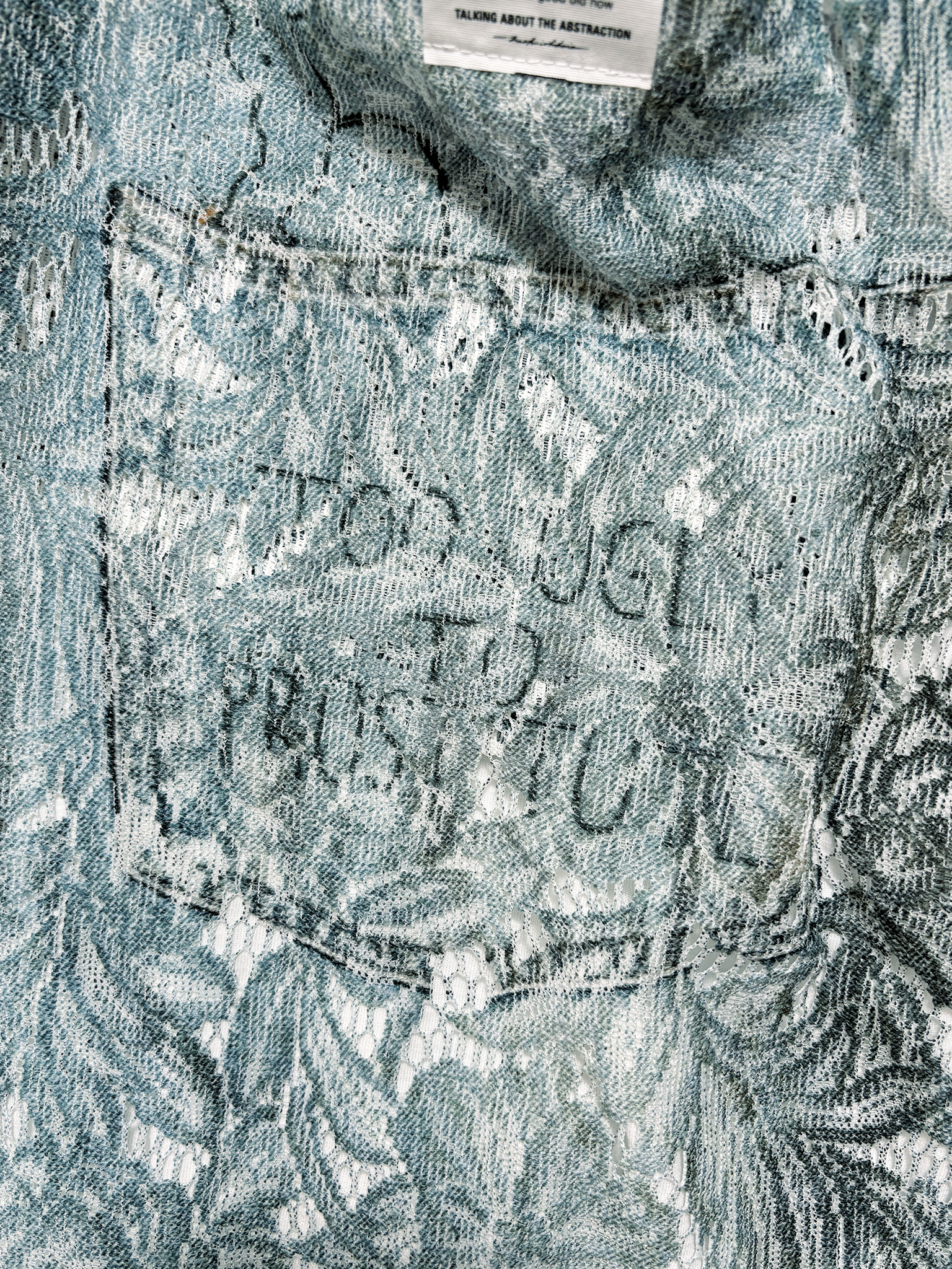 レースの透け感とヴィンテージデニムの無骨さが違和感を生む1枚。
